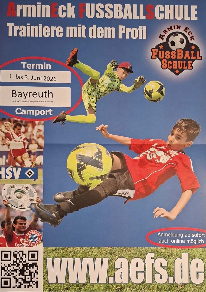 Die Armin Eck Fußballschule wird auch im Jahr 2026 wieder bei unserer Eintracht in Bayreuth zu Gast sein. In den Pfingstferien, von Montag, 1. Juni bis Mittwoch, 3. Juni 2026, erwartet die teilnehmenden Kinder auf dem Camport ein abwechslungsreiches und professionell gestaltetes Fußballcamp nach dem Motto „Trainiere mit dem Profi“.