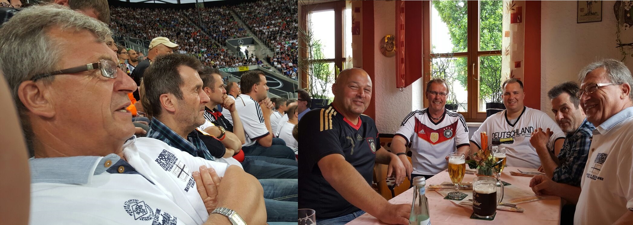 Pünktlich um 11:30 Uhr fuhren 17 Personen in zwei Kleinbussen in südlicher Richtung vom Eintracht-Gelände ab. Erster Stopp, um sich erst mal zu stärken, war das Gasthaus Schenk in Michelfeld (siehe rechtes Bild). Die riesen Portionen (vor allem die Schnitzel) zu sehr fairen Preisen kamen bei der Reisegruppe sehr gut an. Um 13:45 Uhr machte man sich, mit einer kurzen Rast am Köschinger Forst, auf den Weg nach Augsburg. Leider verzögerte sich die Fahrt aufgrund des zähen Verkehrs deutlich und man erreichte erst kurz vor Spielbeginn den Sitzplatz (siehe linkes Bild). In einer flotten ersten Halbzeit sorgten Jogis Jungs für den ersten Torerfolg. Mario Gomez verwandelte in der 13. Minute einen berechtigten Elfmeter souverän. Zur Überraschung der 22.110 Zuschauer konnte die Slowakei das Ergebnis kurz vor der Halbzeit in eine 2:1 Führung umwandeln. Das sollte es dann mit Fußball gewesen sein. Pünktlich zur Halbzeit dachte man die Welt geht unter. Gewitter und Starkregen sorgten für chaotische Verhältnisse. In der 2. Halbzeit, die aufgrund des Wetters auch erst 25 Minuten später angepfiffen wurde, ging spielerisch gar nichts mehr. Für Unterhaltung auf den Rängen sorgten eher einige spektakuläre Rutscheinlagen der Spieler und das unberechenbare Verhalten des Balles. Am Ende siegte die Slowakei mit einem nassen 3:1. Auch auf der Heimfahrt blieb uns das Unwetter durchgehend treu. Nach einem unterhaltsamen und unvergesslichen Erlebnis wurde Bayreuth gegen 23:30 Uhr erreicht.