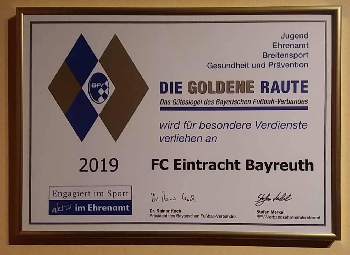 Im Jahre 1998 hat die Ehrenamtskommission des Bayerischen Fußball-Verbandes das Gütesiegel "Silberne Raute" eingeführt, dass Vereine erwerben können, die in Führung, Organisation, sozialem Engagement und in ihren Angeboten den hohen gesellschaftlichen und sportlichen Anforderungen unserer Zeit gerecht werden. Dem FC Eintracht Bayreuth ist es nun im Jahre 2019 gelungen die gewiss sehr anspruchsvollen Kriterien für die Goldene Raute zu erfüllen, nachdem das Gütesiegel bereits 2011 in Silber und 2013 ein weiteres Mal in Silber wiederholt werden konnte. Die vier Aufgabenfelder Ehrenamt, Jugend, Breitensport und Prävention werden jeweils mit zehn Punkten bewertet, wobei obendrein gewisse Grundvoraussetzungen und Pflichterfüllungen gefordert sind. Der FC Eintracht konnte innerhalb eines Jahres von den mindestens geforderten 24 Punkten 29 erreichen, einen Wert, der nur durch das gelebte Ehrenamt auf breiter Basis zu realisieren ist. Gut fünfzig ehrenamtlich tätigen Mitgliedern in vielfältigen Aufgaben gilt hier der besondere Dank! Beim FC Eintracht hat sich im letzten Jahrzehnt gezeigt, dass die ehrenamtliche Vereinsarbeit auf der Basis dieses Gütesiegels nicht ein Muster ohne Wert ist, sondern die gesellschaftlichen Anforderungen letztlich die Grundlage auch für sportliche Erfolge sind. Wenn sich Aktive und Passive in ihrem Verein heimisch und wohl fühlen, entwickeln sich Leistungsstandards, die positiv das Vereinsleben beeinflussen und gestalten. Geld spielt in dieser Kategorie des Ehrenamts im reinen Amateursport eine völlig unter geordnete Rolle.