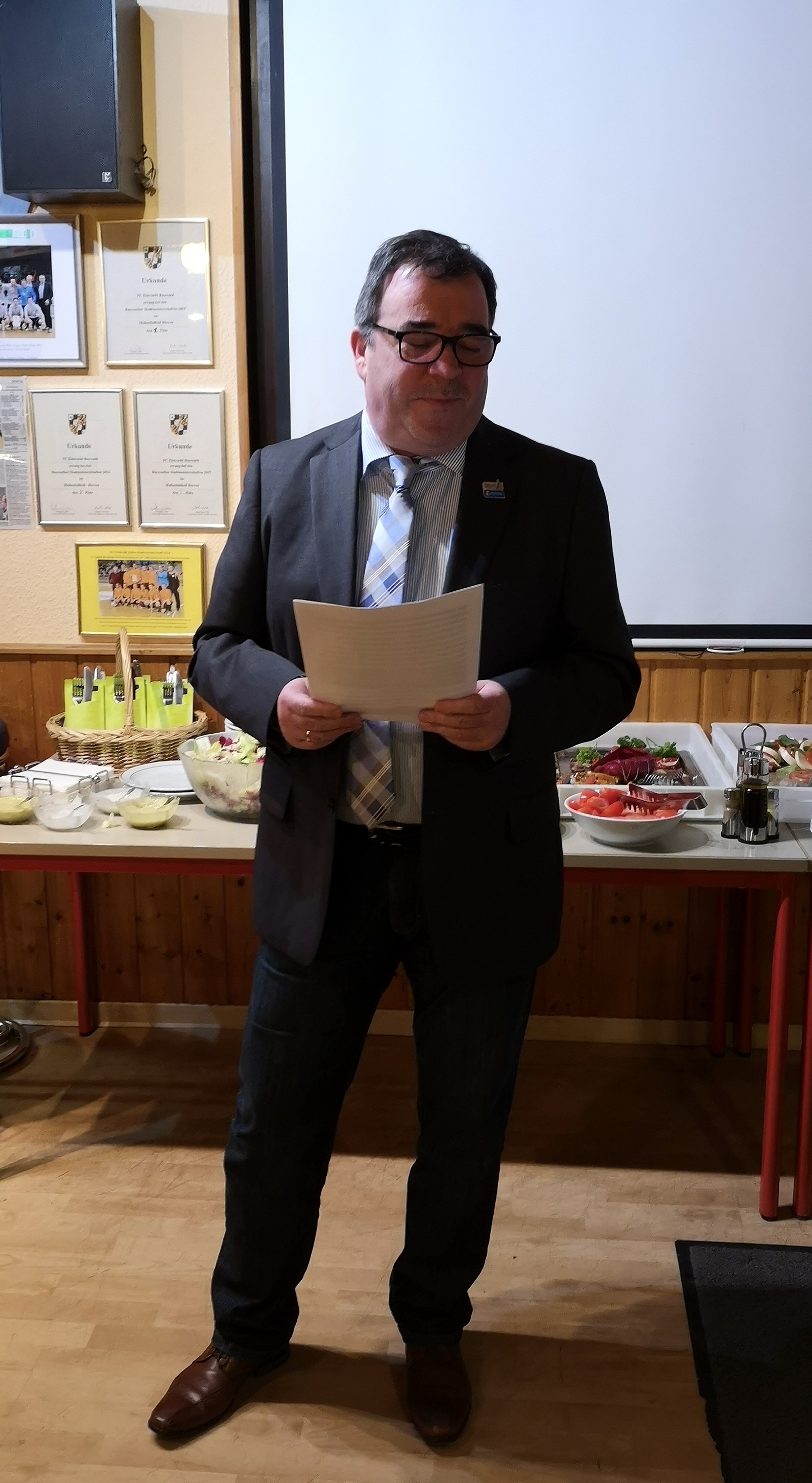 Sehr geehrter Stadtrat Herr Stefan Schuh, sehr geehrter Vorstand Herr Rene Strödecke, werte Sportfreunde, ihr Verein, der FC Eintracht Bayreuth hat sich - im Jahre 2019 erneut - um das Gütesiegel des BVF, die “Goldene Raute“ beworben. Um dieses Gütesiegel des BFV zu erhalten, sind 40 Punkte in vier Kategorien zu erfüllen. Ehrenamtliche Tätigkeiten Jugendförderung Breitensport für alle Altersklassen Prävention - Vorbeugung - u. deren Umsetzung Der FC Eintracht Bayreuth hat alle geforderten Normen mit einen hervorragenden Ergebnis erfüllt - und erhält zu Recht - dieses Gütesiegel des Bayerischen Fußball-Verbandes.