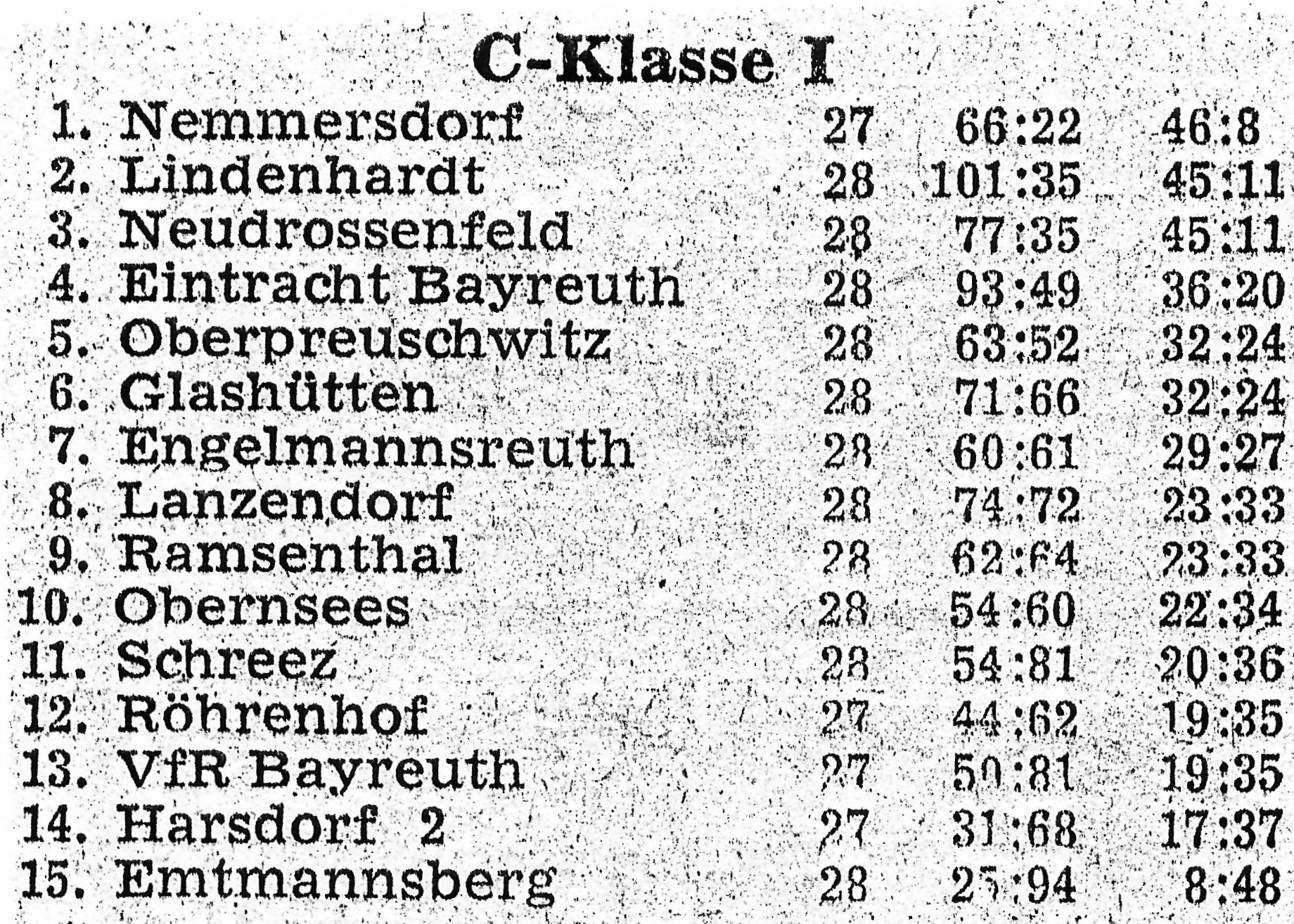 Ein Blick auf die Vereine gut 45 Jahre später: Neudrossenfeld kickte noch in der C-Klasse; mit Nemmersdorf, Engelmannsreuth und Ramsenthal spielen wir aktuell in der Kreisliga; der VfR Bayreuth hatte sich bereits vor Jahrzehnten aufgelöst und auch in Emtmannsberg wird schon seit vielen Jahren kein Fußball mehr gespielt. Der SV Lindenhardt bildet eine Spielgemeinschaft mit Creußen II. Auf die übrigen Vereine sind wir in der Vergangenheit immer wieder getroffen in den jeweiligen Ligen. |