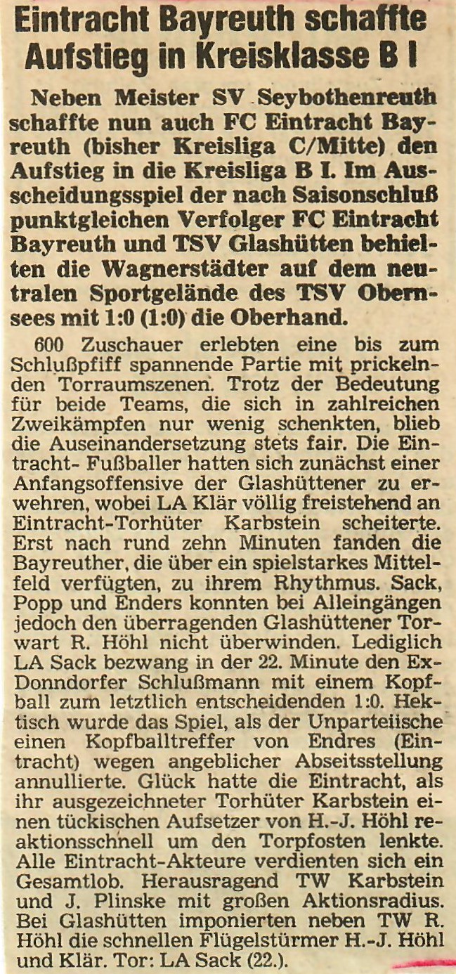 Im 5.Jahr nach der Vereinsgründung gelingt uns unter Spielertrainer Klaus Bachofner der ersehnte Aufstieg. Nach Abschluss der Saison 1978/79 hatte auch der Zweitplatzierte das Aufstiegsrecht zur B-Klasse. Allerdings waren wir punktgleich mit dem TSV Glashütten und so kam es in Obernsees vor 600 Zuschauern zum Ausscheidungsspiel. Die Abschlusstabelle der Saison