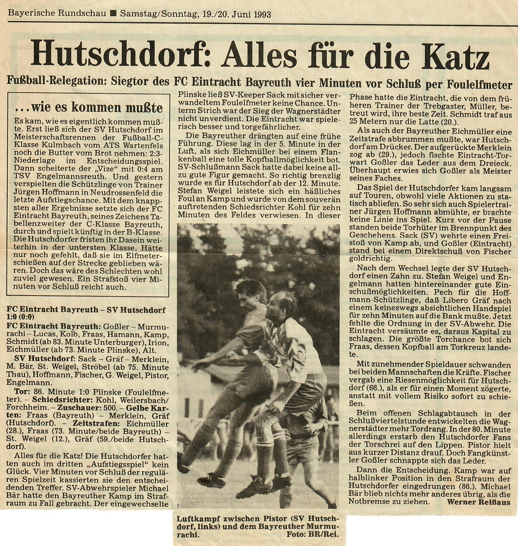 Der Lell behält die Nerven! Unter Trainer Adolf Müller konnte in der C-Klassen-Saison 1992/93 der 2.Platz erreicht werden und so ging man in die Relegation. In Neudrossenfeld gelingt uns gegen den SV Hutschdorf der Aufstieg in die B-Klasse.