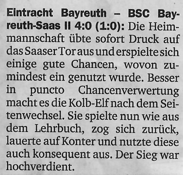 19.10.2019 BSC Saas Bayreuth 2 - FC Eintracht 1 : 4 (0:0) In der 1.Halbzeit treffen wir dreimal Aluminium (13., 33., 45.) und darüber hinaus scheitert Arthur Terentev (19., 43.) zweimal in aussichtsreicher Position. Auf der Gegenseite zwei platzierte Torschüsse (20., 25.), die Daniel Becker im Tor glänzend meistert. Nach der Pause agieren wir auf dem Hartplatz zielstrebiger und werden bald belohnt. Marvin Dressel setzt sich über links energisch durch und Arthur Terentev verwandelt dessen Zuspiel aus kurzer Entfernung zur Führung. Sieben Minuten später bereitet der Arthur nach einem Sololauf über rechts vor und in der Mitte schließt der Chrissi gekonnt ab. Als der Dani weitere sieben Minuten später den Ball aus 14 Metern volley in die Maschen hämmert scheint der Dreier eingetütet. Doch die Gastgeber geben noch nicht auf und werden in der 68.Minute mit dem Anschlusstreffer belohnt und treffen in der 80.Minute die Querlatte. Allerdings treffen der Florian (78.) und der Daniel (88.) erneut Pfosten bzw. Latte. Damit schrauben wir das Verhältnis der Aluminium-Treffer auf 5 : 1, was letztlich unseren verdienten Sieg unterstreicht. In der Schlussminute steuern die Saaser noch ein Eigentor bei.