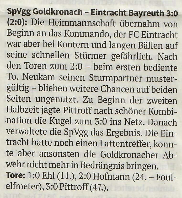FC Eintracht - SpVgg Bayreuth U 21 2 : 4 ( 1:2 ) Der Unterbau der Altstädter begann wie die Feuerwehr und nach einem Kopfball von Justin Duensing, sowie einem Nachschuss von Nils Nickel stand es nach sieben Minuten bereits 2 : 0. Das Spiel der U 21 druckvoll , schnörkellos mit präzisen Pässen in die Tiefe und dort imponierte eine große Laufbereitschaft, die ständig neue Spielvarianten eröffnete. Unsere Jungs waren hier zunächst überfordert, hielten aber im weiteren Fortgang intensiver dagegen Dank des lautstarken Anführers Daniel Heublein. Bruder Florian (20.) hatte nach gelungener Kombination auch die erste Möglichkeit - wurde jedoch in letzter Sekunde geblockt. Wir sind jetzt besser im Spiel; allerdings muss bei schnellen Kontern unser Hüter Daniel Becker mehrfach glänzend in Aktion treten, um weiter Gegentreffer zu vermeiden. Doch auch wir erarbeiten über den wieder in Form kommenden Maxi Ströbel, sowie den sehr agilen Arthur Terentev Möglichkeiten und Daniel Heublein schließt kurz vor der Pause zum Anschlusstreffer ab. Das hohe Tempo der ersten 45 Minuten hat deutlich Spuren hinterlassen und so wird es im 2.Abschnitt "etwas beschaulicher" bei hochsommerlichen Temperaturen. Auch bei den Jungs von der Jakobshöhe läuft nicht mehr alles rund und ein Blackout nutzen wir Dank intensiven Nachsetzens durch Arthur Terentev (55.) zum Ausgleich. Die Dynamik ist zunächst raus und es plätschert ausgeglichen so dahin. Doch zum Ende hin übernehmen wieder die Gäste das Geschehen, weil sie spielerisch und läuferisch nochmal einen "Scheid" bei 30 Grad Celsius auflegen können und kommen letztlich zum verdienten Sieg. Allerdings keine Frage: Für Trainer Adi Kolb sicher ein wertvoller Test, der gegen eine gute Mannschaft ordentlich verlaufen ist und durchaus wertvolle Schlussfolgerungen ergibt. Immerhin waren heute fünf Neuzugänge im Einsatz und Christoph Neuner, gekommen vom SV Schreez, kommentierte sein Debüt :