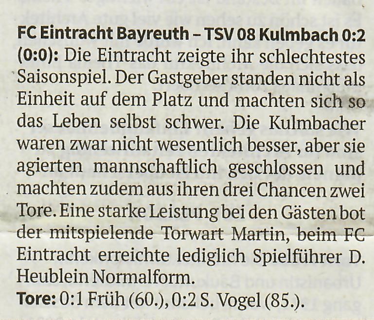 16.04.2023 FC Eintracht - VfB Kulmbach 1 : 3 ( 1:1 ) Es beginnt sehr verhalten auf beiden Seiten; Spiel im Mittelfeld ohne nach vorne öffnende Zuspiele und erwähnenswerte Torabschlüsse nicht vorhanden. Der bis dahin beste Angriff der Gastgeber über die rechte Seite mit Flanke nach innen endet mit einem Foulspiel an Daniel Heublein, der anschließend den fälligen Strafstoß zur Führung verwandelt. Der VfB zeigt sofort Reaktion, geht offensiv ins Pressing, ist körperlich in den Zweikämpfen robust und gewinnt so die Zweikämpfe. Der Ausgleich vor der Pause ist die logische Folge. Die Gäste bleiben auch nach Wiederanpfiff am Drücker und der überragende Amadeo Tasca erzielt die Führung. Das Spiel der Eintracht bleibt ohne jegliche Struktur, der VfB jetzt hoch motiviert setzt weiterhin auf konsequentes Pressing. Selbst die gelbrote Karte gegen VfB-Abwehrchef Andreas Reuther in der 58.Spielminute verschafft den Gastgebern kaum nennenswerte Vorteile. Tasca spielt weiter sein Spiel, hält und verteilt geschickt die Bälle. Eine Zeitstrafe reduziert die Kulmbacher auf acht Feldspieler, was den Spielmacher nicht daran hindert zur Entscheidung einzuschieben. Sehr, sehr deprimierend für die Mannschaft der Eintracht, aber auch für den treuen Anhang!