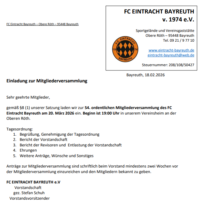 Am 20. März 2026 findet die 54. ordentliche Mitgliederversammlung des FC Eintracht Bayreuth statt. Beginn ist um 19:00 Uhr im Vereinsheim an der Oberen Röth. Neben den Berichten des Vorstands und der Revisoren stehen auch Ehrungen sowie weitere Anträge und Wünsche auf der Tagesordnung. Alle Mitglieder sind herzlich eingeladen, teilzunehmen und sich aktiv ins Vereinsleben einzubringen.