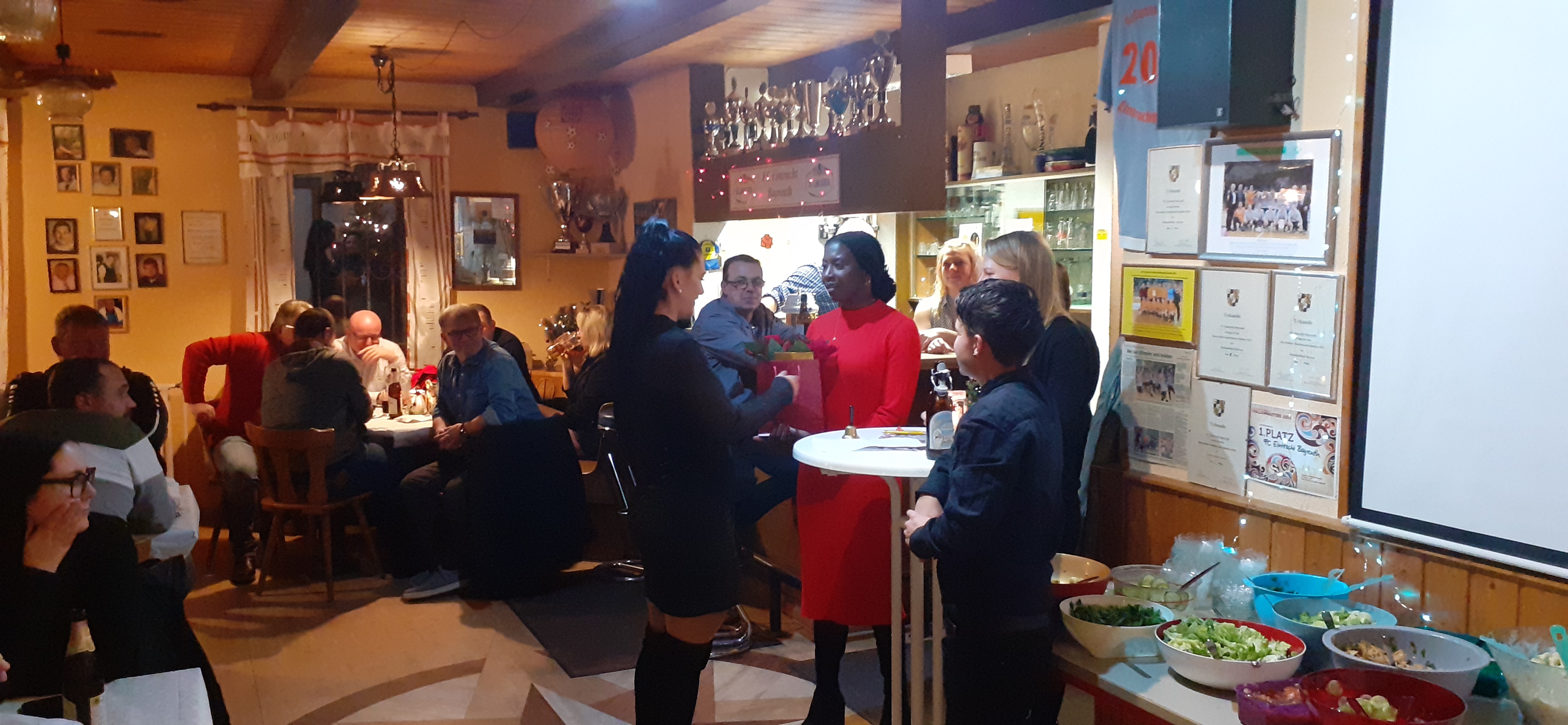 Die Feier verlief verlief sehr harmonisch in angenhmer Atmoshäre und wurde von Wolfgang Rätzer mit einem kurzen Jahresrückblick eröffnet. Von den fleissigen Helferinnen in Küche und Service wurde dann an den Tischen Sauerbraten mit Klößen, Blaukraut und Preiselbeeren serviert. Darüber hinaus konnte man sich noch am Salat Buffet bedienen. Alles sehr schmackhaft! Die Aktiven der Damen- und Herrenmannschaften bedankten sich mit Aufmerksamkeiten bei den Verantwortlichen, die mit viel Einsatz und Herzblut den sportlichen Betrieb im Verein sicherstellen. Dahinter stehen unendlich viele ehrenamtliche Stunden, die für Außenstehende gar nicht sichtbar sind. Dank auch an all diejenigen, die mit viel Energie eine Tombola ins Sportheim "zauberten", womit der offizielle Teil der Feier endete. Besonders hervorheben müssen wir unseren Event-Auschuss - hier hat das Team von Rosi Borger erneut Großartiges geleistet!