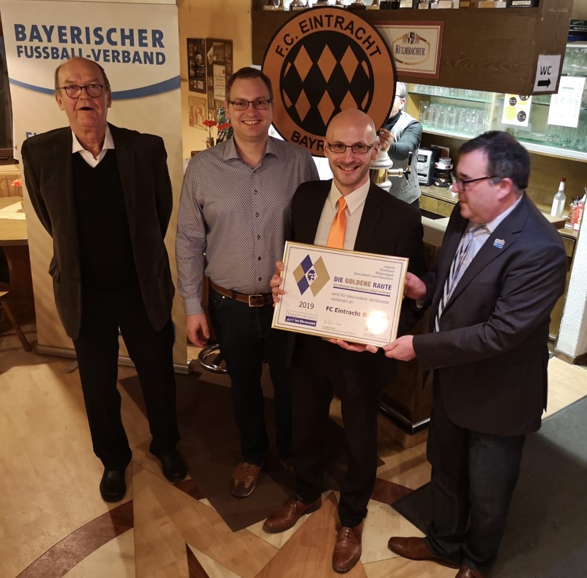 Im Jahre 1998 hat die Ehrenamtskommission des Bayerischen Fußball-Verbandes das Gütesiegel "Silberne Raute" eingeführt, dass Vereine erwerben können, die in Führung, Organisation, sozialem Engagement und in ihren Angeboten den hohen gesellschaftlichen und sportlichen Anforderungen unserer Zeit gerecht werden. Dem FC Eintracht Bayreuth ist es nun im Jahre 2019 gelungen die gewiss sehr anspruchsvollen Kriterien für die Goldene Raute zu erfüllen, nachdem das Gütesiegel bereits 2011 in Silber und 2013 ein weiteres Mal in Silber wiederholt werden konnte. Die vier Aufgabenfelder Ehrenamt, Jugend, Breitensport und Prävention werden jeweils mit zehn Punkten bewertet, wobei obendrein gewisse Grundvoraussetzungen und Pflichterfüllungen gefordert sind. Der FC Eintracht konnte innerhalb eines Jahres von den mindestens geforderten 24 Punkten 29 erreichen, einen Wert, der nur durch das gelebte Ehrenamt auf breiter Basis zu realisieren ist. Gut fünfzig ehrenamtlich tätigen Mitgliedern in vielfältigen Aufgaben gilt hier der besondere Dank! Beim FC Eintracht hat sich im letzten Jahrzehnt gezeigt, dass die ehrenamtliche Vereinsarbeit auf der Basis dieses Gütesiegels nicht ein Muster ohne Wert ist, sondern die gesellschaftlichen Anforderungen letztlich die Grundlage auch für sportliche Erfolge sind. Wenn sich Aktive und Passive in ihrem Verein heimisch und wohl fühlen, entwickeln sich Leistungsstandards, die positiv das Vereinsleben beeinflussen und gestalten. Geld spielt in dieser Kategorie des Ehrenamts im reinen Amateursport eine völlig unter geordnete Rolle.