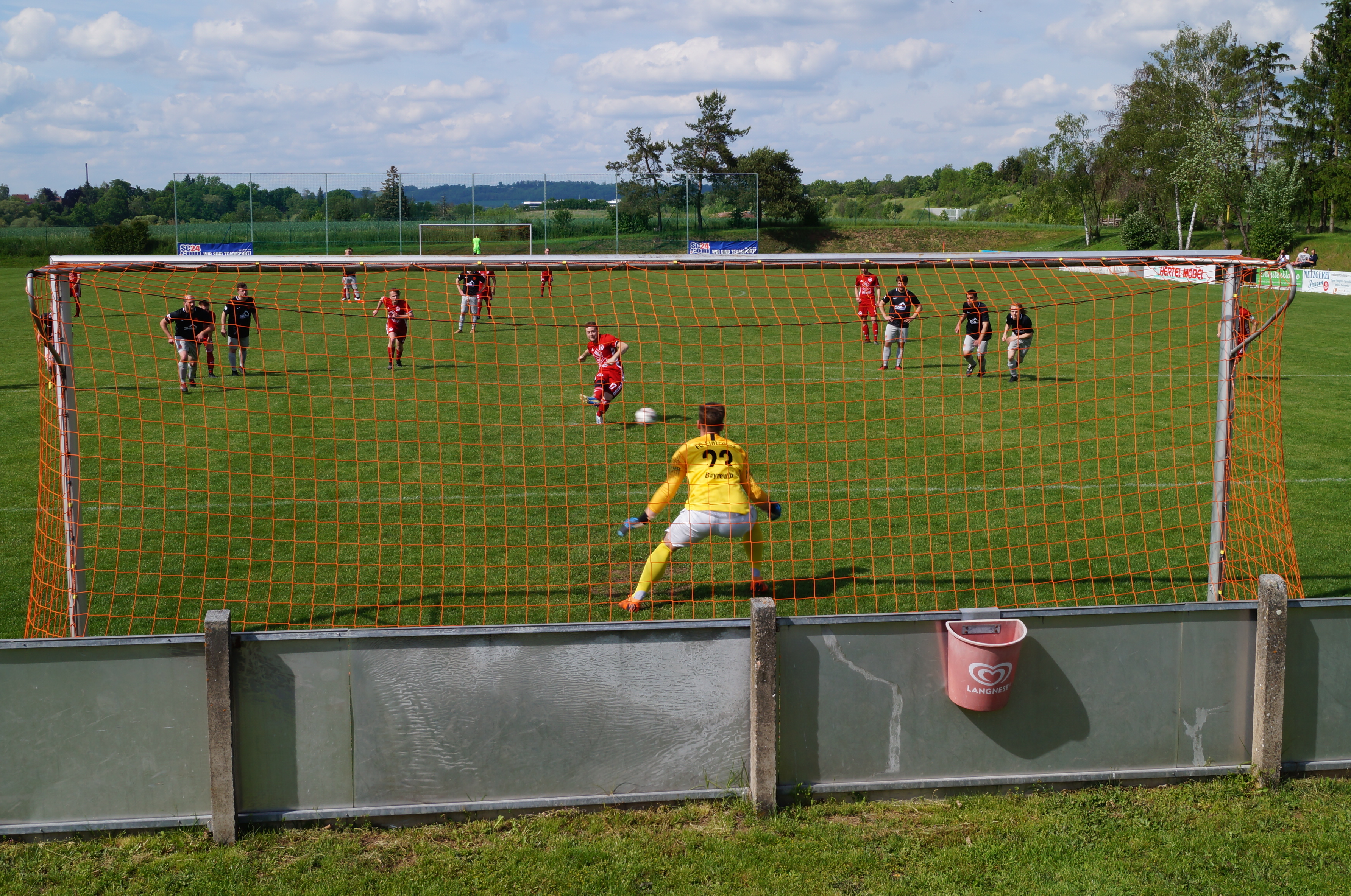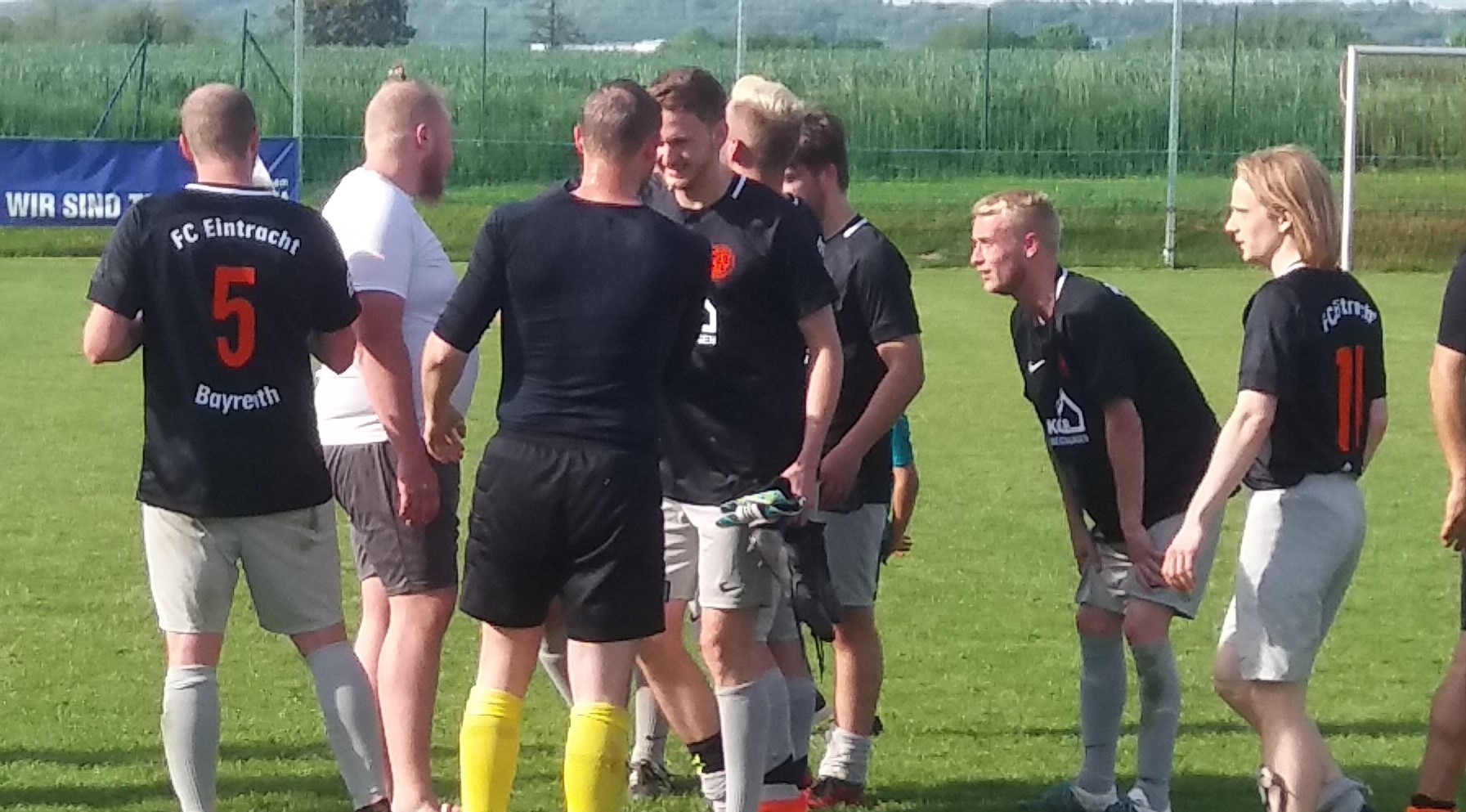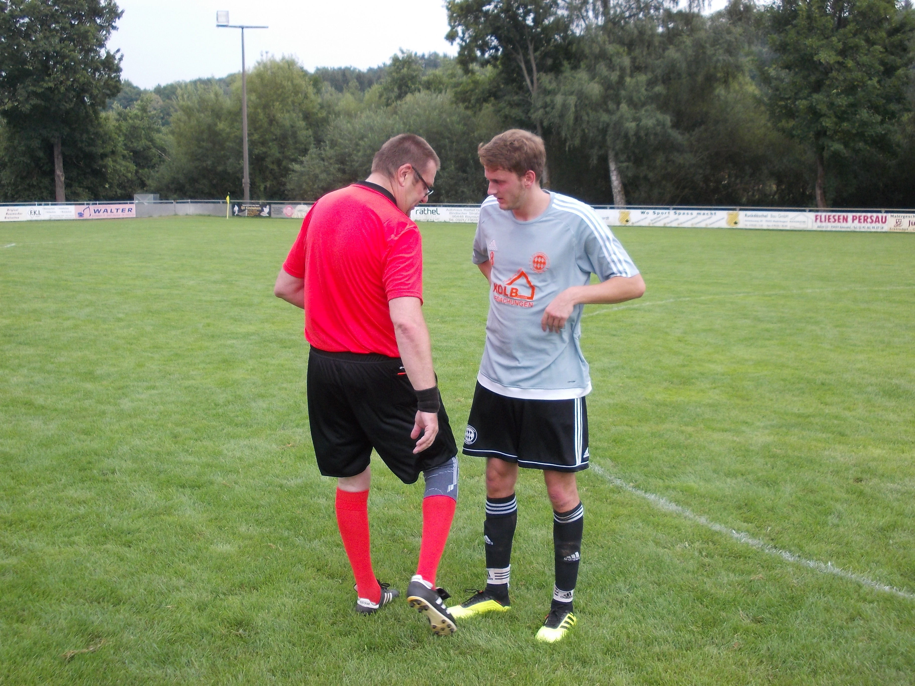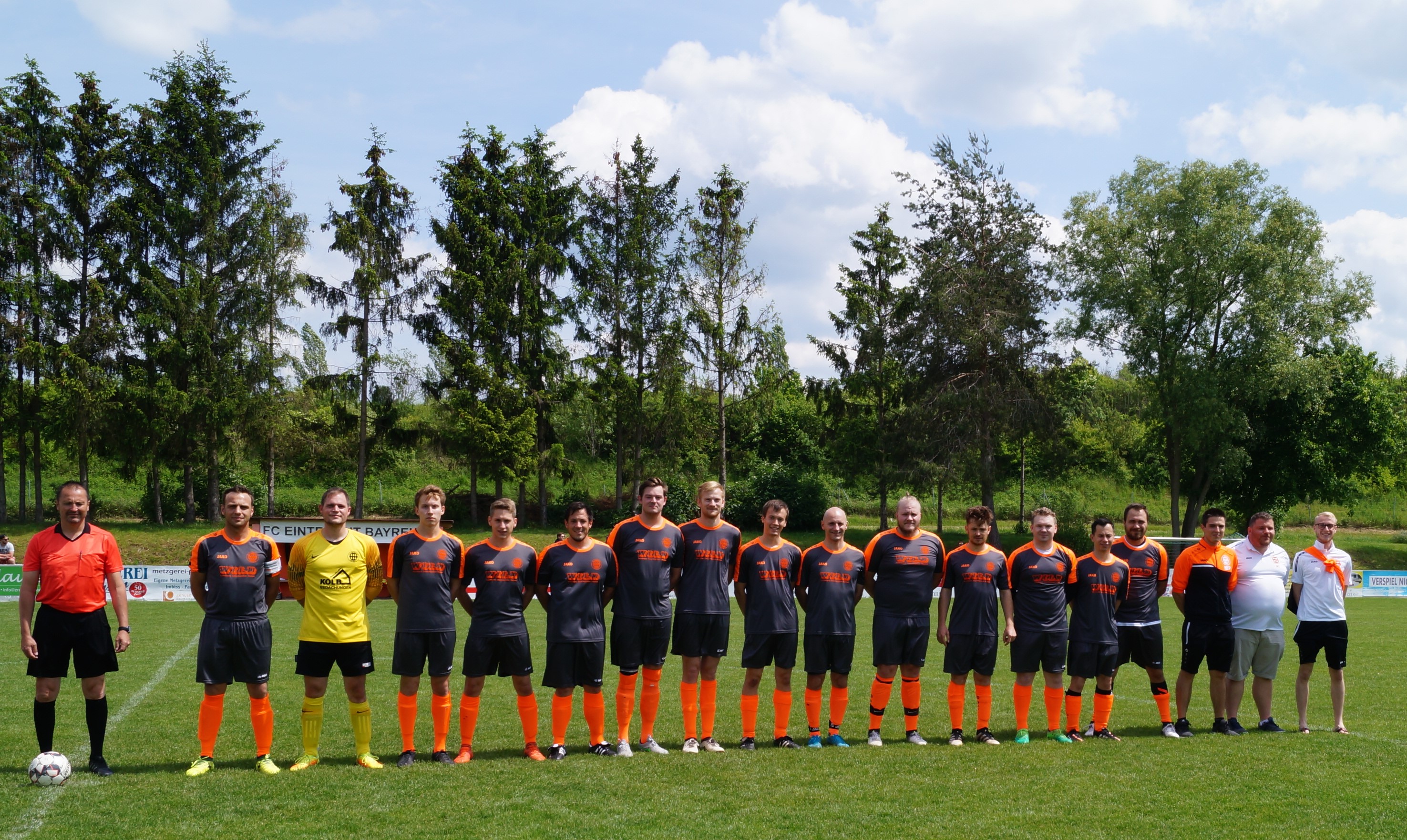 Als die Mannschaften kurz vor 14:00 Uhr das Spielfeld betreten, zeigt das Thermometer 37,5 Grad an. Fast schon unmenschlich Fußball zu spielen und daher ein grosses Kompliment an alle Akteure einschl. SR Ludwig Dinger aus Bischofsgrün.