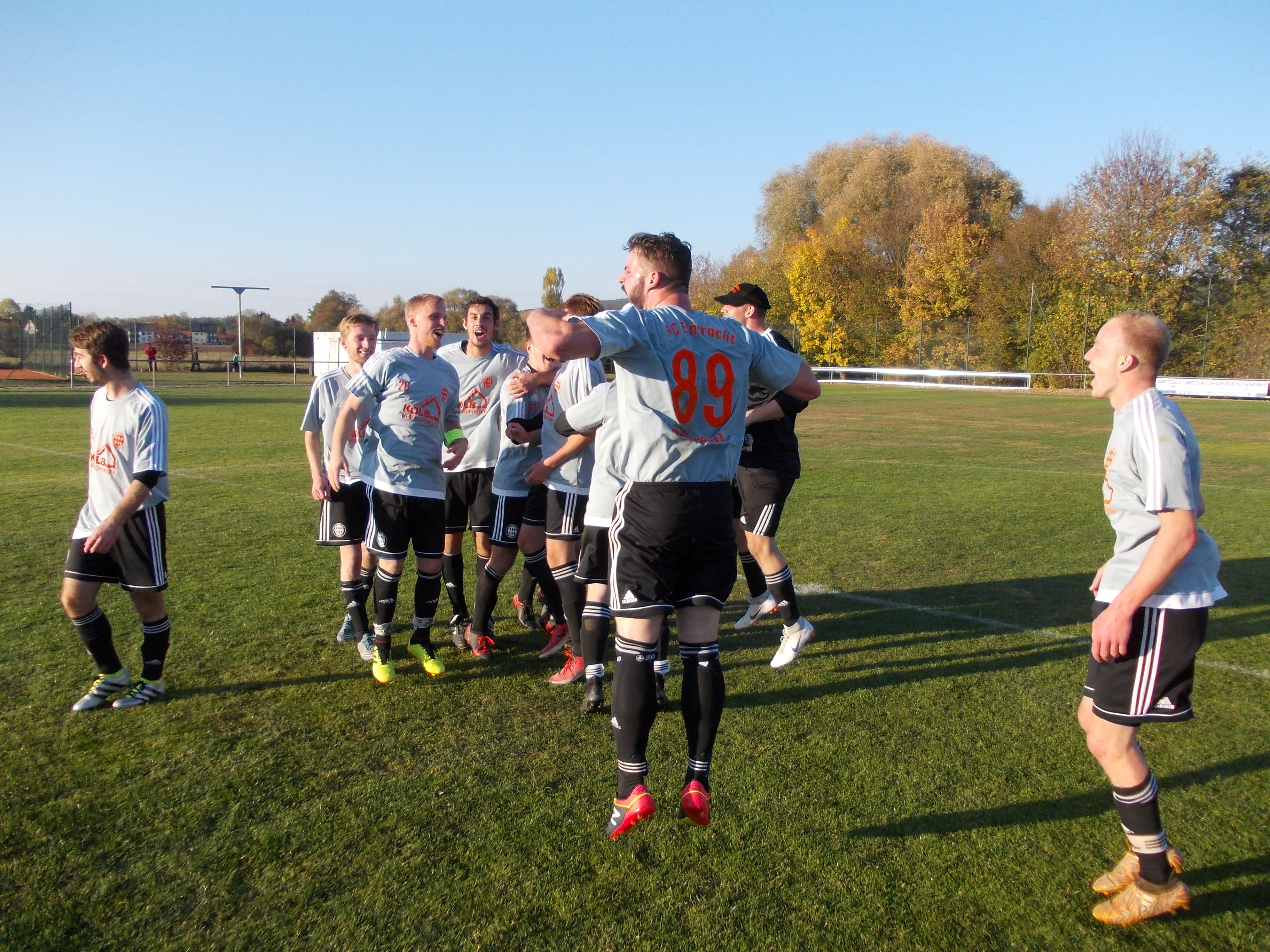 Sensationell die Einstellung, die Power und vor allem die Moral unserer Mannschaft - auch nach 0:2 bzw. 2:3 Rückstand. Diese Tugenden übertrugen sich auch auf die zahlreichen Anhänger in orange-schwarz; denn zu jeder Sekunde glaubte man draußen fest an den Sieg, weil der unbändige Siegeswillen unserer Jungs über die 97 Spielminuten förmlich alles überstrahlte. Am Ende ein hoch verdienter Sieg der eindeutig besseren Mannschaft. Der Krimi, den Edgar Wallace nicht besser hätte verfilmen können, in Zahlen: 1 : 0 (12.) Christian Schreiber 2 : 0 (22.) Daniel Möschel 2 : 1 (58.) Mike Baumgarten 2 : 2 (63.) Philipp Fiebig 3 : 2 (69.) Philipp Horn 3 : 3 (77.) Florian Heublein 3 : 4 (81.) Daniel Heublein 3 : 5 (90+2.) Florian Heublein Der Mike war der Dosenöffner, der Philipp löste Euphorie aus, der erneute Rückstand schockte kurz und wenig später entschieden die Heublein-Brüder die Relegation. Entscheidend aber die Leistung aller Akteure, die heute Eintracht-Geschichte geschrieben haben. Deshalb sind auch besonders zu erwähnen die beiden Jan´s, Daniel zwischen den Pfosten, Dimi, Tim, Tobias, Michi, Hüseyin, Alan und Marcel. 450 Zuschauer sahen ein hoch dramatischen Spiel.