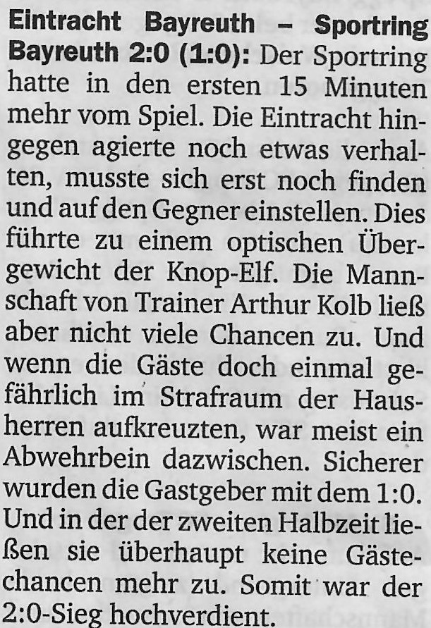 15.09.2019 FC Eintracht - FSV Bayreuth 2 : 1 (1:1) Mit TW Daniel Becker, sowie die Offensivkräfte Michael Schreiner-Schelhorn und Jan Freisinger hatte Eintracht-Trainer Arthur Kolb gleich drei Stammkräfte aus der ersten Elf zu ersetzen. Dafür stand Christopher Schwarzer zur Verfügung und der wurde im Laufe des Spieles gegen seinen "alten Verein" zu einem ganz wichtigen Stabilisator der Gastgeber. Auf der Gegenseite hatte auch FSV-Coach Claudio Eismann personelle Probleme und so musste er u. a. mit Andre Stricker einen Feldspieler zwischen die Pfosten stellen. Der Gast ging durch Bastian Zapf (3.) frühzeitig in Führung, die "Dauerläufer" Daniel Heublein nach langem Ball von Jan Reingruber nach einer Viertelstunde ausglich. Es entwickelte sich ein lebhaftes und interessantes Spiel, bei dem die Gastgeber - gemessen an Torchancen - gewisse Vorteile hatten. So in der 35.Minute, als eine herrliche Direktkombination über rechts etwa zwei Meter vor der Torlinie mit dem Dimi einen Abnehmer fand - allerdings ging der Ball zur Überraschung aller noch über die Querlatte. Den Dimi hat´s sicher am meisten geärgert! Nach der Pause ging es lebhaft weiter mit gekonnten Aktionen auf beiden Seiten; aber auch jetzt ein Plus für die Gastgeber - so zum Beispiel der Lattentreffer von Daniel Heublein in der 85.Minute. Als man sich auf beiden Seiten bereits mit einem Remis abgefunden hatte, zirkelte Tim Murgas in der 87.MInute einen Freistoß vor das Tor und Philipp Fiebig war mit dem Kopf goldrichtig zur Stelle. Aufseiten der Gastgeber sind besonders zu erwähnen: Matthias Prang gab im Tor sein Debüt in der 1.Mannschaft und machte seine Sache sehr ordentlich. Tim Murgas bereitete nicht nur den Siegestreffer vor, sondern gehörte in der Defensive, als auch mit seinen Offensivaktionen heute zu den Matchwinnern! 0 : 1 (3.) Bastian Zapf 1 : 1 (15.) Daniel Heublein 2 : 1 (87.) Philipp Fiebig