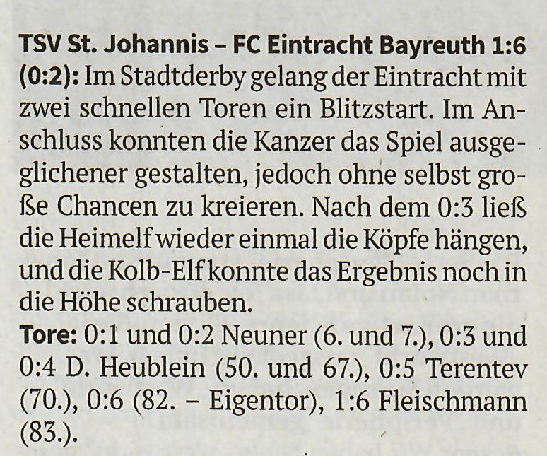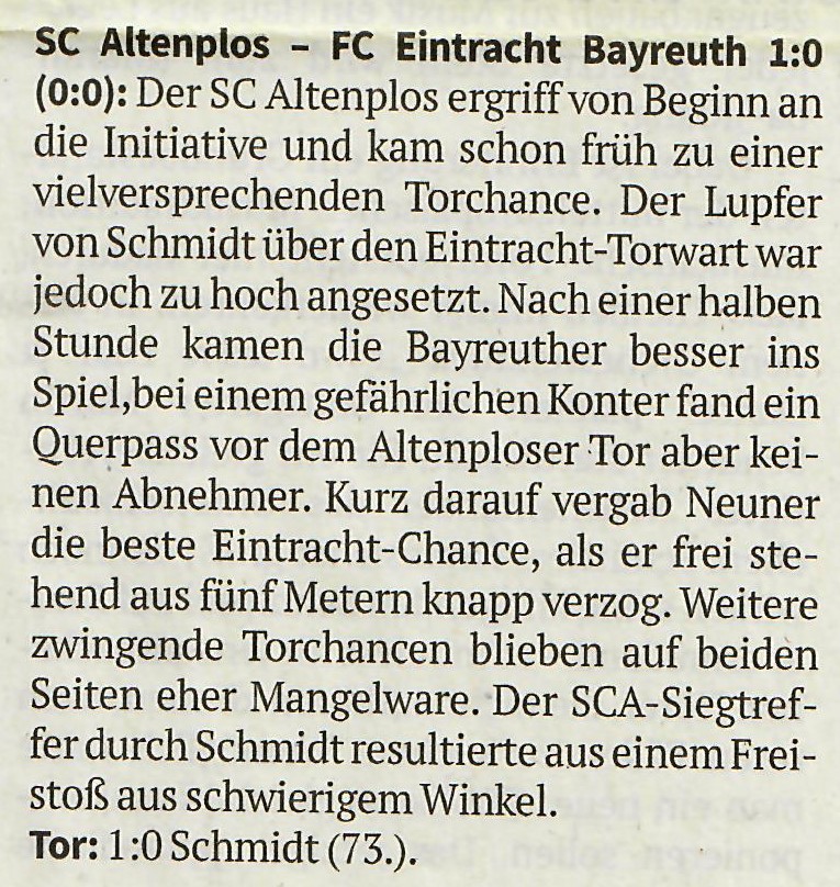 FC Eintracht - SpVgg Bayreuth U 21 2 : 4 ( 1:2 ) Der Unterbau der Altstädter begann wie die Feuerwehr und nach einem Kopfball von Justin Duensing, sowie einem Nachschuss von Nils Nickel stand es nach sieben Minuten bereits 2 : 0. Das Spiel der U 21 druckvoll , schnörkellos mit präzisen Pässen in die Tiefe und dort imponierte eine große Laufbereitschaft, die ständig neue Spielvarianten eröffnete. Unsere Jungs waren hier zunächst überfordert, hielten aber im weiteren Fortgang intensiver dagegen Dank des lautstarken Anführers Daniel Heublein. Bruder Florian (20.) hatte nach gelungener Kombination auch die erste Möglichkeit - wurde jedoch in letzter Sekunde geblockt. Wir sind jetzt besser im Spiel; allerdings muss bei schnellen Kontern unser Hüter Daniel Becker mehrfach glänzend in Aktion treten, um weiter Gegentreffer zu vermeiden. Doch auch wir erarbeiten über den wieder in Form kommenden Maxi Ströbel, sowie den sehr agilen Arthur Terentev Möglichkeiten und Daniel Heublein schließt kurz vor der Pause zum Anschlusstreffer ab. Das hohe Tempo der ersten 45 Minuten hat deutlich Spuren hinterlassen und so wird es im 2.Abschnitt "etwas beschaulicher" bei hochsommerlichen Temperaturen. Auch bei den Jungs von der Jakobshöhe läuft nicht mehr alles rund und ein Blackout nutzen wir Dank intensiven Nachsetzens durch Arthur Terentev (55.) zum Ausgleich. Die Dynamik ist zunächst raus und es plätschert ausgeglichen so dahin. Doch zum Ende hin übernehmen wieder die Gäste das Geschehen, weil sie spielerisch und läuferisch nochmal einen "Scheid" bei 30 Grad Celsius auflegen können und kommen letztlich zum verdienten Sieg. Allerdings keine Frage: Für Trainer Adi Kolb sicher ein wertvoller Test, der gegen eine gute Mannschaft ordentlich verlaufen ist und durchaus wertvolle Schlussfolgerungen ergibt. Immerhin waren heute fünf Neuzugänge im Einsatz und Christoph Neuner, gekommen vom SV Schreez, kommentierte sein Debüt :